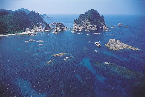 鳥取県岩美町の海岸景観「浦富海岸」。「浦富海岸」は岩美町の15kmの海岸線全てを指した名称です。古くから景勝地として知られ、日本百景(昭和2年)、名勝及び天然記念物(昭和3年)、山陰海岸国立公園(昭和38年)などに指定されるとともに、平成22年10月には、浦富海岸を含む山陰海岸ジオパークが、世界ジオパークネットワークに加盟認定されました。