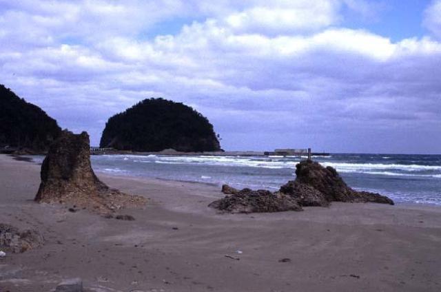 鳥取県岩美町の海岸景観「羽尾岬」。羽尾岬は、山陰海岸学習館の北側に位置しています。岬の西側は冬季の厳しい季節風と荒波によって浸食された険しい海食崖が連続し、東側は対照的に優美に湾曲した砂浜が形成されています。