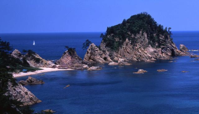 鳥取県岩美町の海岸景観「菜種島」。菜種島は浦富海岸の島々の中でも最大で、高さ60m、周囲400mの険しい崖となってそそり立っています。毎年4月中旬に崖の中腹に野生の菜の花が咲き誇ります。江戸時代に菜種を積んだ北前船がこの島の付近で座礁したことがあり、その後花が咲くようになったと伝えられています。菜種島を先端として、5個の島が連なっているのが「菜種五島」です。