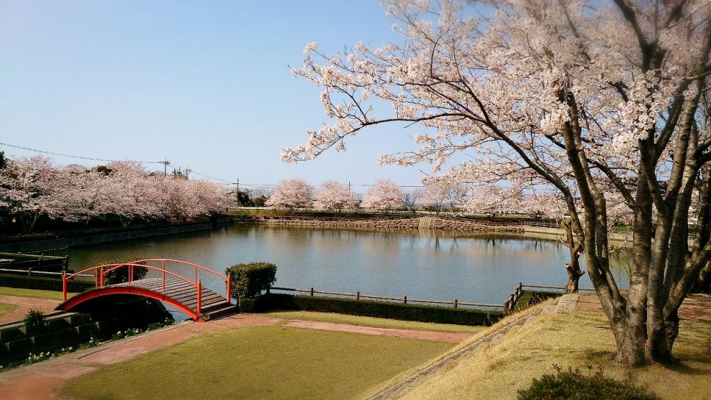 鳥取県琴浦町の公園「水辺公園」。国指定特別史跡斎尾廃寺跡の近くに位置し、白鳳期に建立されたとする斎尾廃寺をイメージした朱色の柱が鮮やかなコミュニティー施設「白鳳館」に隣接する公園です。遊歩道・多目的運動広場・遊具・休息所を備えています。桜の名所でもあり、水辺を囲むように植えられたソメイヨシノが美しく咲き誇ります。