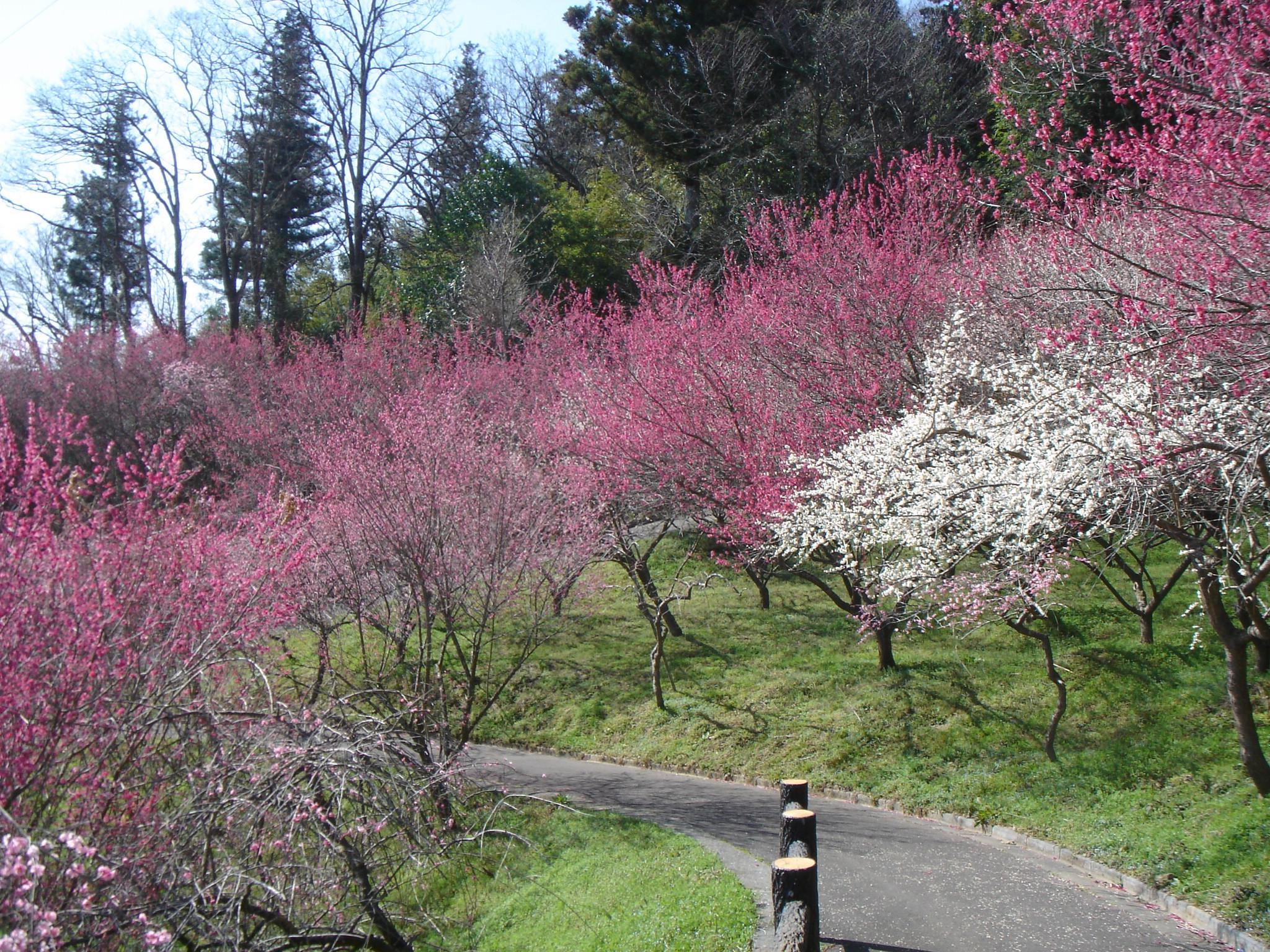 岡山県津山市の公園「梅の里公園」。中国地方最大級、約2000本の梅林です。14種類の紅白の梅の花が楽しめる。