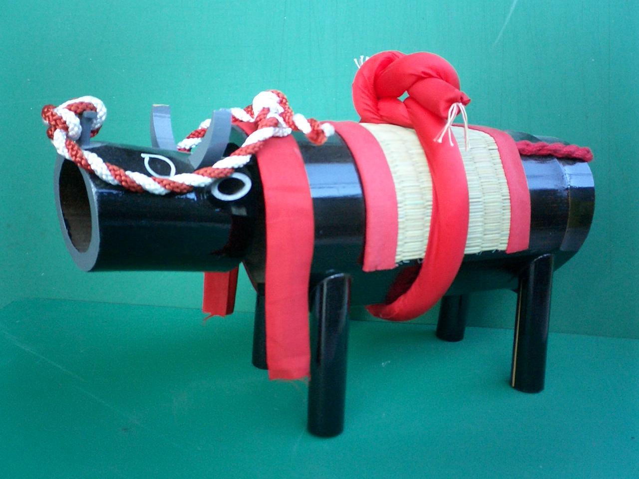 岡山県津山市の伝統工芸技術「作州牛」。中国地方山間部で飼育され、力強く知性に富んだ和牛が出稼ぎに行く姿を、竹細工で表現したものです。単純なつくりが美しく、竹材の特質がよく生かされています。昭和60年には、年賀切手のデザインに採用されました。