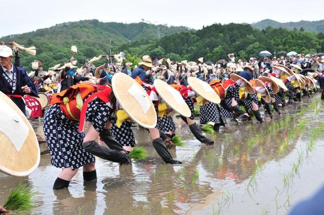 広島県北広島町の郷土芸能「壬生の花田植」。「壬生の花田植」は、その年の稲作の無事と豊作を祈願する伝統行事です。毎年6月の第一日曜日に1万人近い観衆のもと盛大に開催されています。10頭以上の飾り牛、80人以上の早乙女や囃しが織りなす花田植は国内最大規模で、壮観で華麗な初夏の一大田園絵巻と称賛されています。平成23年11月にユネスコの無形文化遺産に登録されました。その翌年は、登録後初ということもあり、1万5千人もの人が訪れ、例年以上の賑わいでした。.