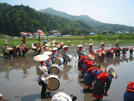 広島県北広島町の郷土芸能「原東大花田植」。太鼓・笛・鉦などのリズミカルな田ばやしに合わせて、華やかに装った早乙女たちが、唄いながら田植えをする。昔ながらの「花田植」が今もしっかりと受け継がれています。