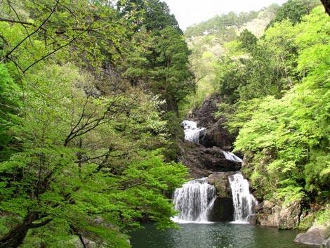 広島県北広島町の河川景観「三ッ滝」。国の特別名勝に指定される三段峡最大の滝。聖湖(ダム堰堤)から約200m下流に位置し畳岩と呼ばれる巨岩に挟まれた三曲五段の滝で、全体の高さ約31m、滝つぼ中程の深さは3.5mもあります。周囲の針葉樹広葉樹が混合した原始林と相まって、深緑・紅葉と一層美しさを増します。