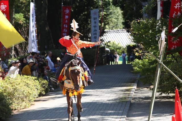 福岡県糸島市の行事・祭事「桜井神社流鏑馬」。桜井神社の新嘗祭(秋祭り)で行われる古式豊かで勇壮な行事です。およそ150メートルの参道に50cm四方程の的が置かれ、2人の武者が馬で駆け抜けながら白羽の矢で3箇所の的を射ます。この神事は五穀豊穣、無病息災を願って1635年(寛永12年)から約380年もの間、毎年欠かさず奉納されてきた伝統行事で、以前は地域の人が農耕馬にまたがって矢を放ち、相撲も奉納されていたそうです。現在は流鏑馬神事と稚児行列がとり行われています。