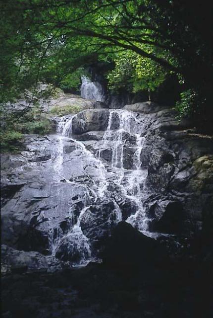 福岡県糸島市の河川景観「千寿院の滝」。源氏から逃れ、身を潜めていた平重盛内室の千姫,福姫が水遊びをしたという幅12m、落差約15mの美しい滝です。カエデやスギに囲まれ、白糸を引いたような姿がとても幻想的です。