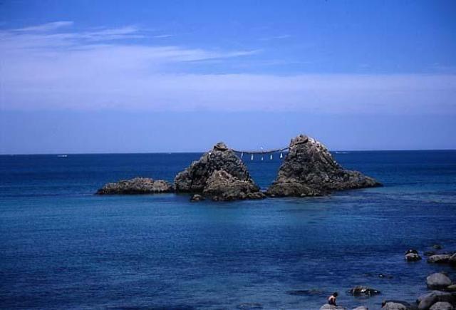 福岡県糸島市の特殊地形「桜井二見ケ浦」。朝日の伊勢二見ケ浦に対し夕日の二見ケ浦とも呼ばれる、県指定の名勝です。海上にしめ縄で結ばれた夫婦岩が仲良く並んでいます。日本の渚百選、日本の夕日百選。