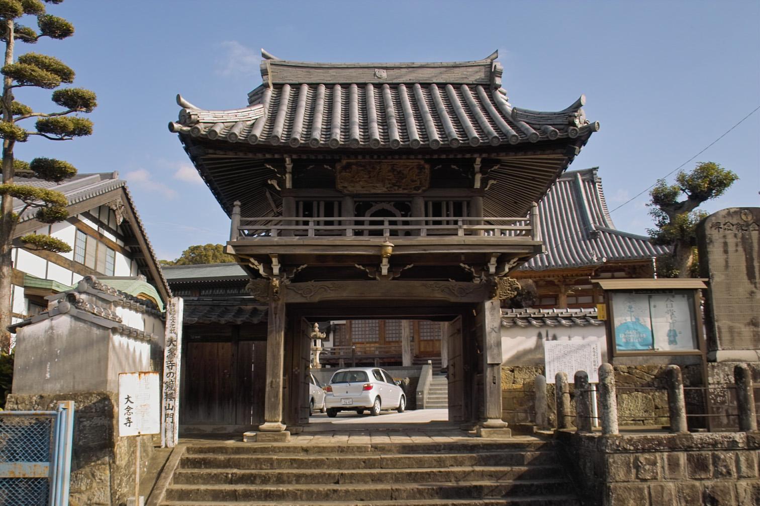 長崎県佐世保市の歴史的建造物「大念寺の鐘楼山門」。大念寺は天文10年(1541)川尻隠岐守開基と伝える古刹である。現在の山門は嘉永3年(1850)に再建されたもので、鐘楼堂を兼ねた、いわゆる袴腰鐘楼の門である。この種の袴腰鐘楼を兼ねた山門は、鎌倉以降好んで造られ、この門には虹梁、木鼻、花頭窓などに江戸期の特徴が見られる。佐世保市内で唯一残る江戸期の鐘楼山門として貴重である。