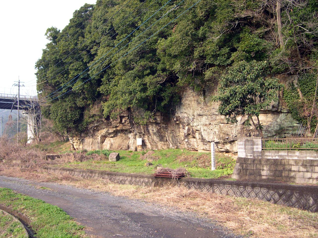 長崎県佐世保市の史跡「下本山岩陰遺跡」。相浦川河口近くの標高16m砂岩露頭に位置している。昭和45年(1970)に発掘調査が行われ、縄文時代前期(約6,000年前)を中心とする多くの遺物が出土した。石鏃等の狩猟具に加え、釣針