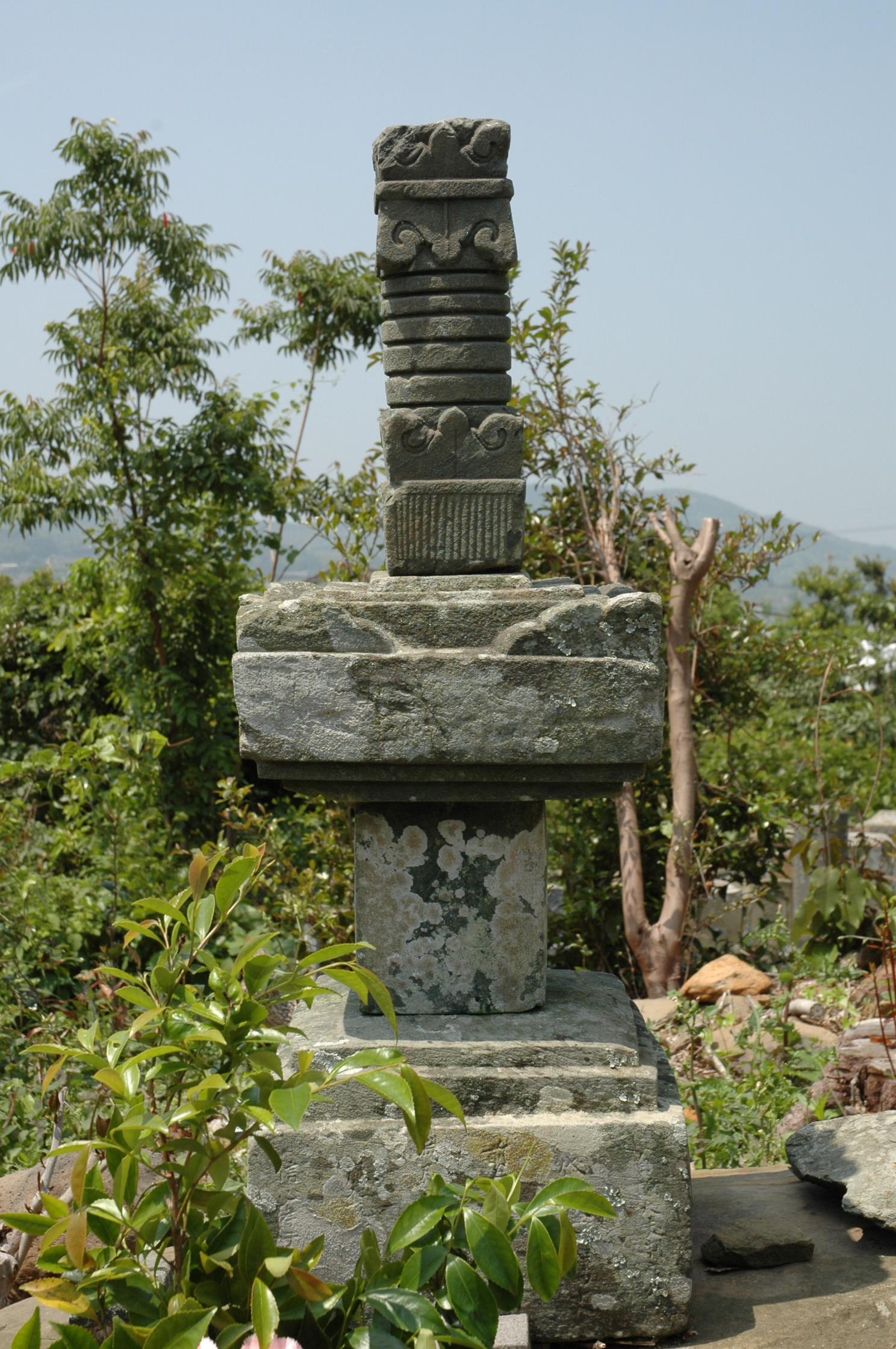 長崎県佐世保市のその他「松浦丹州盛の墓」。東漸寺東側の墓地にある緑泥片岩製の宝篋印塔で、墓碑銘から応仁元年(1467)に建立された宗家松浦氏第13代盛の墓であることがわかっている。製作年代が明確な完形宝篋印塔で、緑泥片岩製石塔の編年上貴重な標準資料であり、石造美術品としても貴重である。