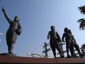 長崎県佐世保市の展望施設「展海峰(展望台)」。九十九島をパノラマ風景として一望できる展望台です。春には菜の花、秋はコスモスが楽しめます。展望所には、サーカスのジンタで有名な「美しき天然」を作曲した佐世保海兵団軍楽長であった田中穂積の銅像もあります。