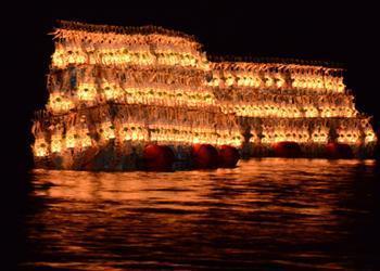 長崎県島原市の行事・祭事「島原の精霊流し」。8月15日は、島原の伝統行事、精霊流しが開催されます。竹と藁で作られ、繊細で美しい切子灯ろうが飾りつけられた島原独特の精霊船。切子灯ろうのロウソクを灯した精霊船が故人の親族や友人らに担がれ、「ナマイド」「ナマイド」の掛け声とともに夜の有明海に流浮かぶ姿は幻想的です。300有余年の伝統を誇り、島原の夏の風物詩として毎年多くの観客で賑わいを見せます。