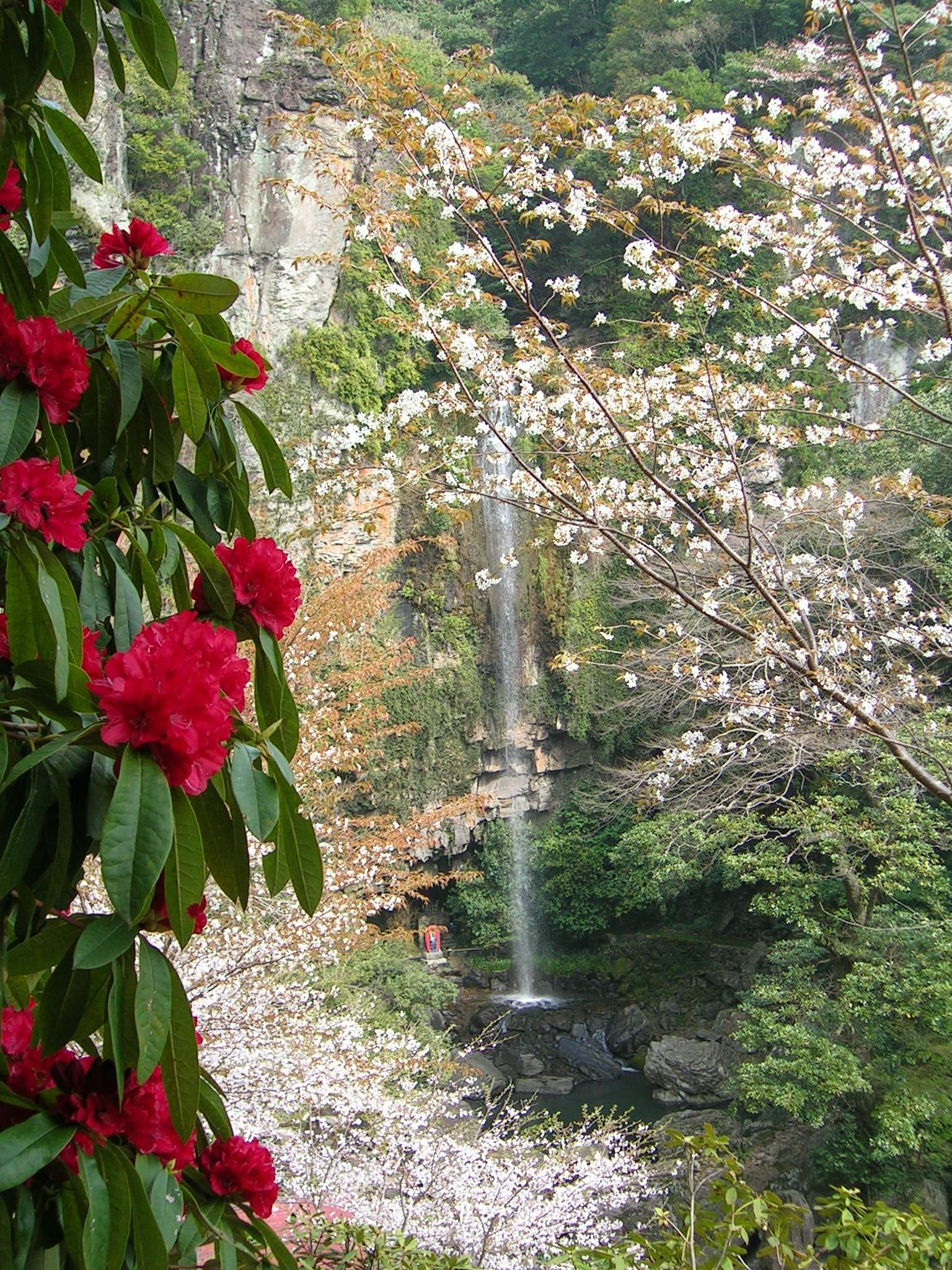 長崎県大村市の公園「裏見の滝自然花苑」。落差30mの滝を有する裏見の滝自然花苑は、滝壺まで遊歩道が整備されており、4月上旬から5月上旬まで彩り鮮やかな世界のシャクナゲ約40種類、約6000本を楽しむことができます。