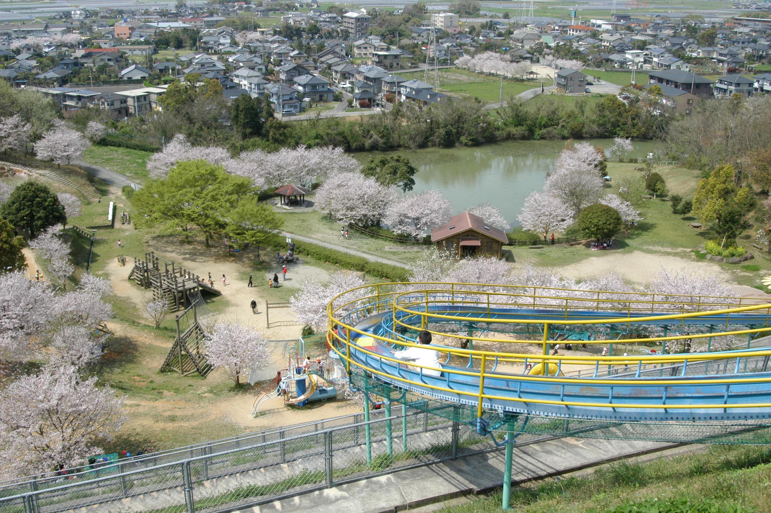 熊本県宇城市の公園「岡岳公園」。一番人気の全長80メートルのローラースライダーは大迫力のスケール!グラウンドやテニスコートも併設されており、春には桜が楽しめます。