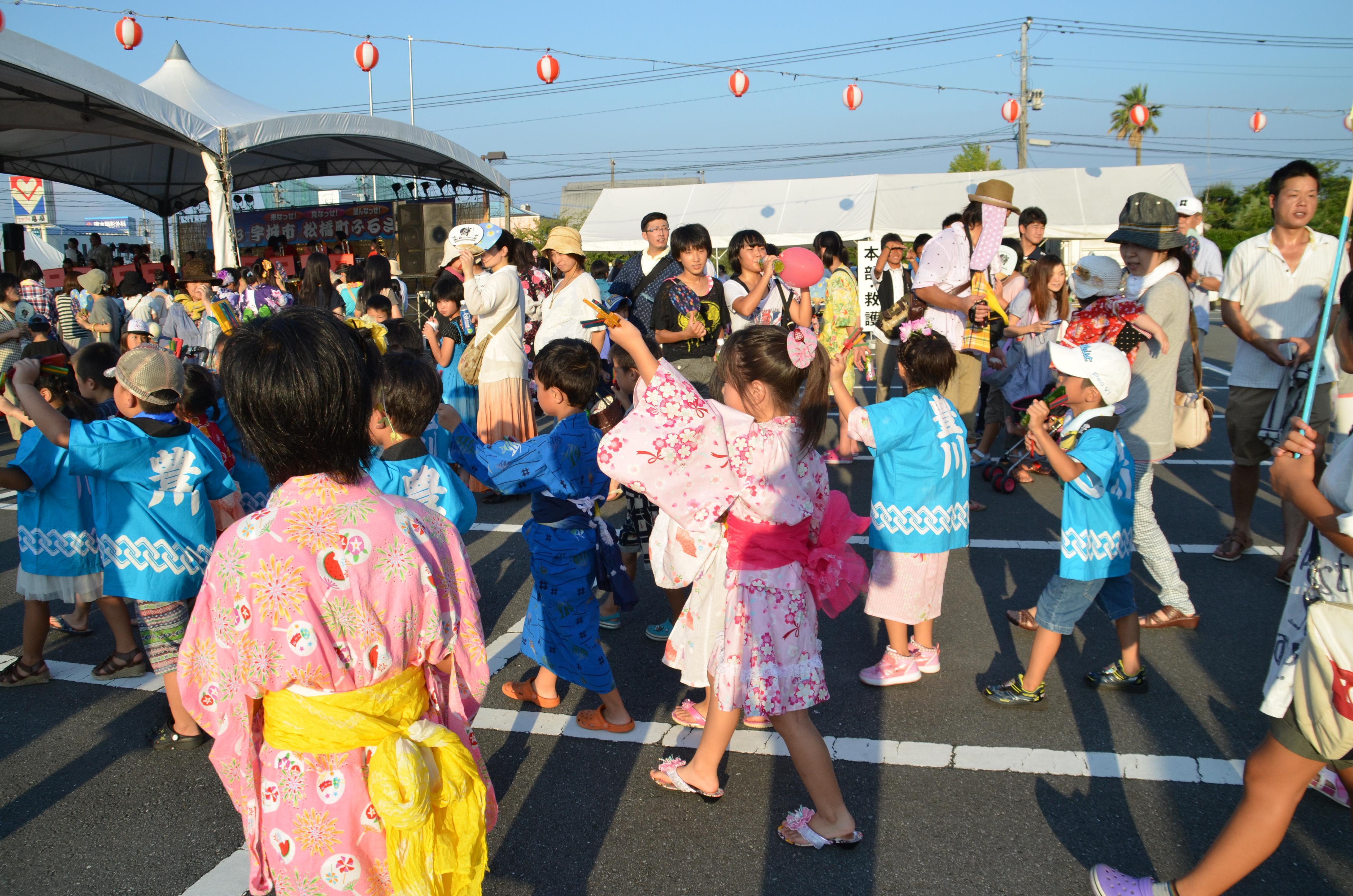 熊本県宇城市の行事・祭事「宇城市松橋町ふるさと祭り」。地域の保育園児、婦人会などの町民総踊りや商工会による出店多数。また毎年恒例の花火大会も開催。住民一体となった夏の一大イベントです。(8月開催)