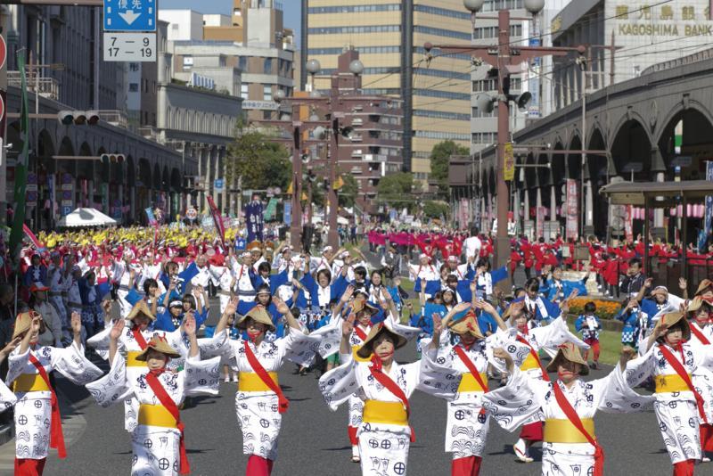 鹿児島県鹿児島市の行事・祭事「おはら祭」。昭和24年に市制施行60周年を記念して始まった「おはら祭」は、南九州最大の祭りとして発展してきています。2万人を超える踊り手が、鹿児島を代表する民謡「おはら節」や「鹿児島ハンヤ節」「渋谷音頭」にあわせて練り踊る「総踊り」を中心に、躍動感あふれるダンス「オハラ21」、「パレード・マーチング&伝統芸能」、多くの子どもたちでにぎわう「YOU遊広場」など、いろいろな催しが行われます。