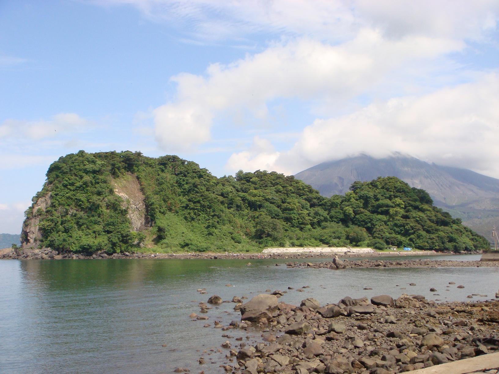鹿児島県垂水市の海岸景観「江之島」。240種余りの植物が生育する緑の小島。対岸からは錦江湾に浮かぶ江之島と壮大な桜島があり、すばらしい景観が臨めます。