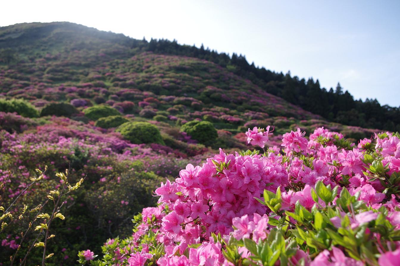鹿児島県垂水市の植物「高峠ツツジ」。高峠ツツジは学名“サタツツジ”。高隈山地に広がる高峠高原は、景勝地として有名だが、このツツジの群生地としても名高いです。山麓の南側および南東部一帯50平方mに、総数約10万本、100種類にもおよぶ一大群生をなしています。新緑を背景にした色とりどりの花が、優雅な眺めを楽しませてくれます。