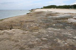 鹿児島県知名町の特殊地形「大津勘海岸ビーチロック」。知名町指定の天然記念物です。ビーチロックのある大津勘長浜海岸は、ウミガメが産卵に来る場所でもあります。ビーチロックとは砂浜に出来た石灰質砂岩のことで、ここには長さ200メートル、最大幅40メートルともいわれる石灰質砂岩が地表に現れています。サンゴ礁のある砂浜にできることが多く、地下水にとけている石灰が太陽熱を吸収し、砂や珊瑚を固めて出来たと言われています。