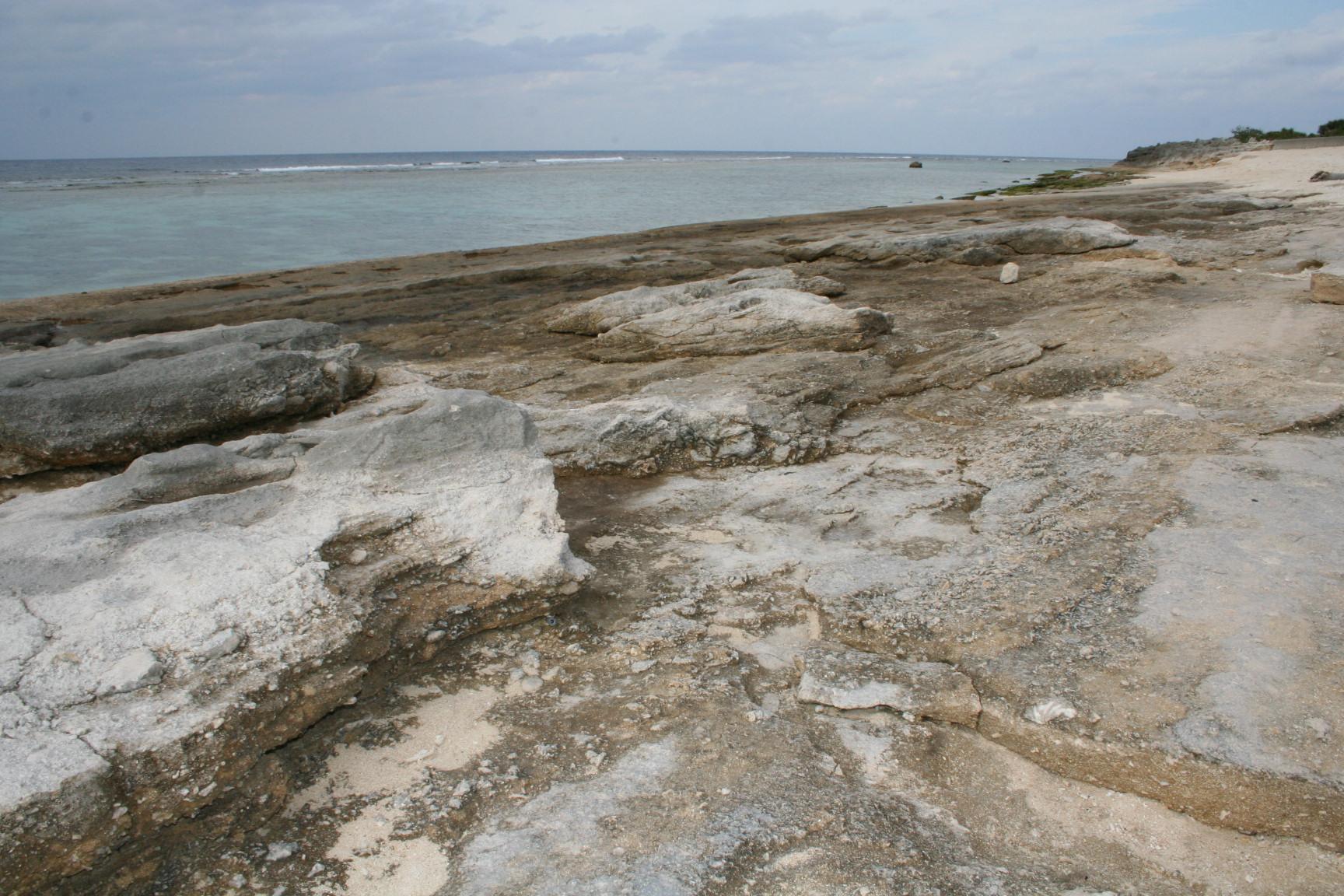 鹿児島県知名町の海岸景観「ビーチロック」。ビーチロックは、炭酸カルシウムのセメント作用により海浜堆積物が固まってできた板状の石灰質の砂礫岩。知名町指定天然記念物。