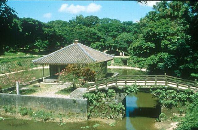 沖縄県那覇市の名所「弁財天堂」。朝鮮から贈られた方冊蔵経が納められていた弁財天堂。蓮の葉が浮ぶ円鑑池の中島に建つ木造瓦葺の堂である。天女橋によって円鑑池の北側と結ばれている。