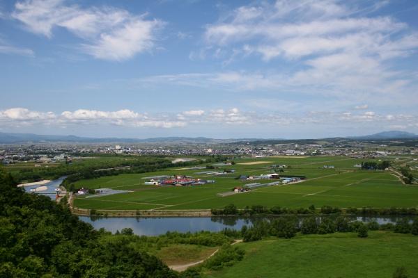 北海道深川市の公園「国見公園」。国見峠は旧国道12号にあり、音江連山の東部に有る沖里河山山麓が石狩川と接する所にあります。上川道路工事の着手時において、吉村彦九郎らによって命名された峠です。標高154メートルの展望台があり、石狩川沿いに広がる深川市を一望出来ます。