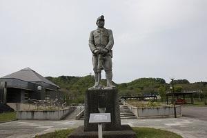 北海道上砂川町の歴史的建造物「敢闘像」。昭和20年、石炭の増産意欲を向上するために実在の炭鉱夫をモデルに作成された像。現在は「かみすながわ炭鉱館」の前に移設され、今も、中央竪坑を、そして上砂川の現在を見続けています。