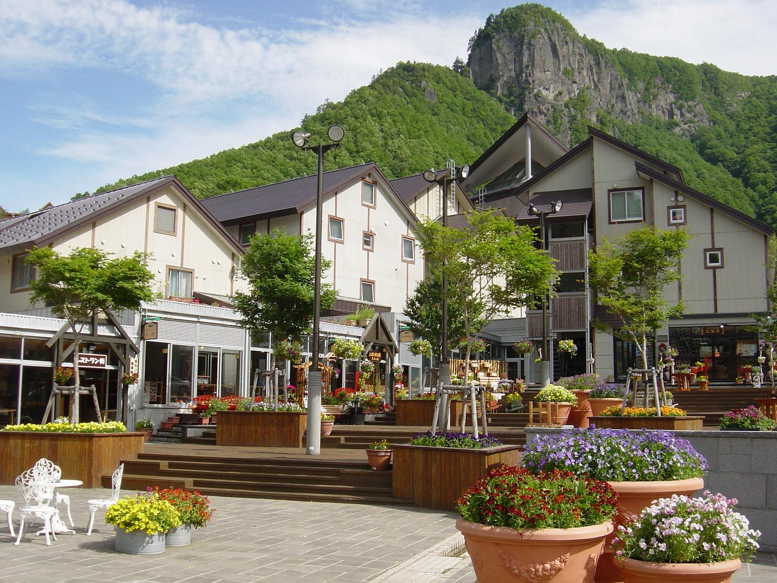 北海道上川町の花見「層雲峡温泉花ものがたり」。層雲峡の温泉街が、大型花壇やつり鉢などを使った色鮮やかなガーデニングで彩られ、来ていただいた方をあたたかく迎えます。