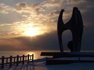 北海道猿払村の名所「インディギルカ号遭難者慰霊碑」。この慰霊碑は、昭和14年12月、浜鬼志別沖の荒れ狂う吹雪の中で、旧ソ連の貨客船「インディギルカ号」が座礁転覆した際に失われた700名以上の貴い命を悼み、昭和46年に建立されました。世界の海難史上に残る大惨事の発生を知り、村民総出で約400人を救出した行為と犠牲になった人々の魂よ安かれと祈る心を顕した慰霊碑は、国境を越えた人間愛の証として、訪れる人々の心に今日も大切なものは何かを語りかけています。