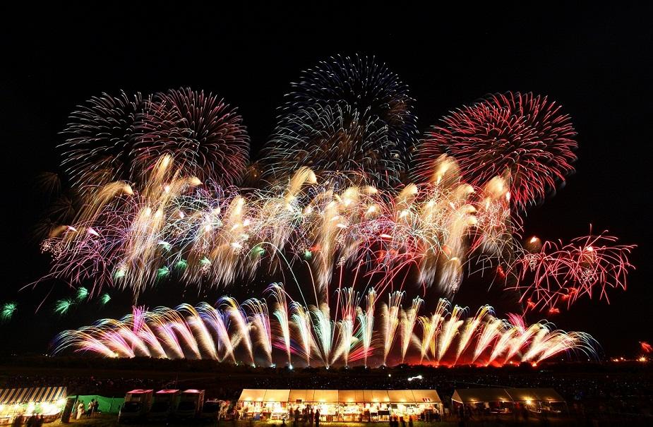 山形県鶴岡市の行事・祭事「赤川花火大会」。赤川河川敷の広さを生かし、約700mの範囲で、約12000発の花火を打ち上げる。全国デザイン花火競技会として選りすぐりの業者が参加し、各社の自慢の花火を打ち上げる。