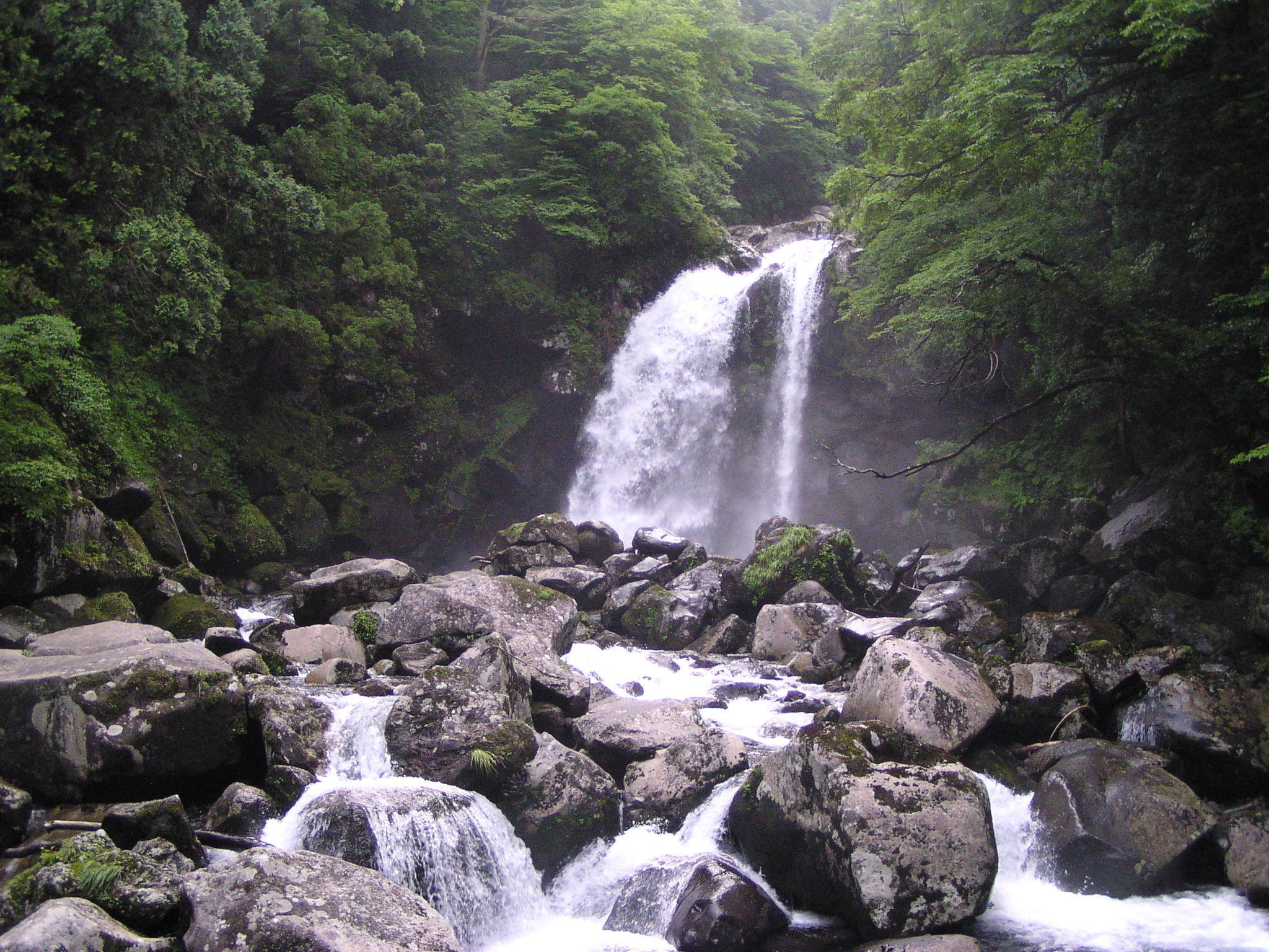 山形県遊佐町の河川景観「二の滝」。駐車場から遊歩道を下って行くと一ノ滝に到着します。滝つぼに降りる道はありませんが、途中まで降りられる階段があります。一ノ滝から先は渓流沿いに遊歩道がついているので、渓流や木々、山野草を楽しみながら歩きます。30分ほどで二ノ滝に到着です。二ノ滝は落差25メートルの滝です。2条に分かれて落ちる滝は均整がとれた美しい滝で、雪解けの時季は膨大な水量により迫力のある滝に姿を変えます。二ノ滝の上流に続く登山道沿いにも間ノ滝、三ノ滝など多くの滝や渓谷を楽しめます。