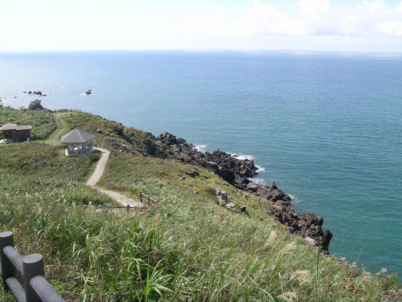 山形県遊佐町の自然歩道・自然研究路「三崎公園」。鳥海山の溶岩流が海に流れ込み、それが長い時間を経て波に浸食されて断崖絶壁となっています。公園内には、観音崎・大師崎・不動崎という3つの岬があり、これが日本海に突き出ていることから、三崎と呼ばれています。断崖絶壁に沿った海岸線は開けており、貴重な植物群落があり、石畳の遊歩道が整備されています。その中には白亜の羽後三埼灯台がそびえており、海の難所でもある付近の海上交通を見守っています。
