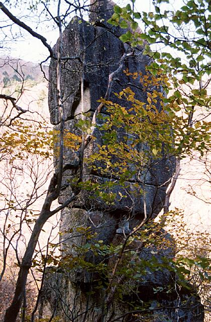 群馬県みどり市の名所「相輪塔(袈裟丸山)」。袈裟丸山中腹、寝釈迦の対岸にあり、高さ十数メートル、幅3メートル程の自然石で、上部が大きく下につれて細くなっています。