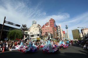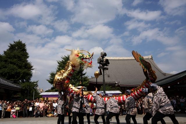 東京都台東区の郷土芸能「金竜の舞」。金龍の舞は、昭和33年(1958)に浅草寺本堂再建を記念して創始奉納された舞です。浅草寺の山号「金龍山」から名をとったこの舞は、松林に見立てた浅草寺幼稚園園児による松慈童と、観音さまを象徴する蓮華珠が1名、これを守護する金龍(長さ約18m)を8名が操作し、浅草組合花組のお囃子のなか勇壮華麗にとり行われます。