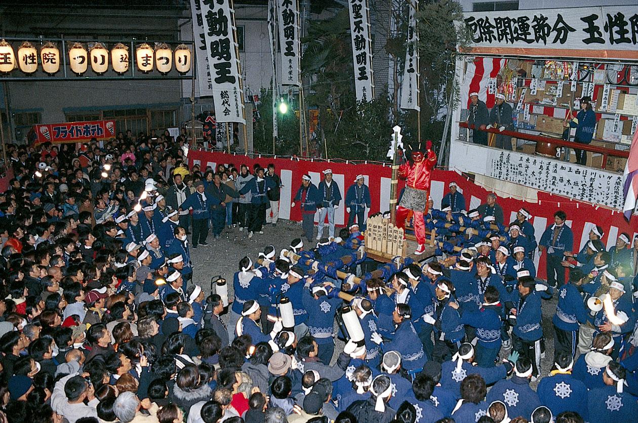 岐阜県岐阜市の行事・祭事「玉性院節分つり込み祭り」。赤鬼にふんした厄男を神輿に、おかめにふんした厄女を御所車に乗せ町内を練り歩いた後、本堂に担ぎ込み、おはらいをして無病息災を祈る行事。クライマックスは赤鬼が担ぎ手の中に飛び込み、もみくちゃにされながら本堂につり込まれます。