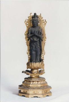 岐阜県笠松町の伝統工芸技術「木造千手観音立像」。頭の上に十一面の像をいただき、多くの脇手をもつ千手観音像です。現在、両方の脇手は失われています。顔の表情はおだやかであり、身に着けている衣の彫り方はとても素晴らしいものです。台座の裏には墨書きがあり、それによると寛文3年(1663年)京都の仏師の中沢九兵尉正勝によって造られたことがわかります。この像も一木造りで、古い時代の色に似せて造られています。高さ20センチです。