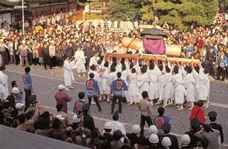 愛知県小牧市の行事・祭事「田縣神社の豊年祭」。近くの神明社をお旅所とし、古色蒼然たる男根を描いた大幟を立て、次に巨大な木彫りの大男茎形をのせたみこしを納め、玉姫命の夫神、建稲種命の武者姿のみこしを、白衣着用の厄男がかつぎ、社殿まで繰り込む。