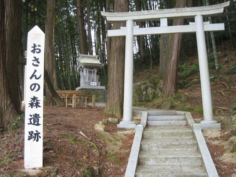 兵庫県丹波市の歴史的建造物「おさんの森」。恋愛成就と咳の神様近松門左衛門「おさん茂兵衛」のヒロインである、京都大経師(暦屋)の美しい妻おさんが手代の茂兵と密通の疑いをかけられ、かけ落ちしてこの丹波の森まで来て、咳をしたために追手に捕らえられてしまったといわれています。下町沖田の旧但馬街道には小さな祠があり、咳の出る肺の病の治療を念じる人により灰がたくさん供えられています。近年では、恋の成就にと若者の参拝も多いようです。