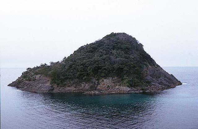 兵庫県香美町の海岸景観「黒島」。今子浦の眼前にある黒っぽい凝灰角礫岩からなる小島。クロマツが多く生育している