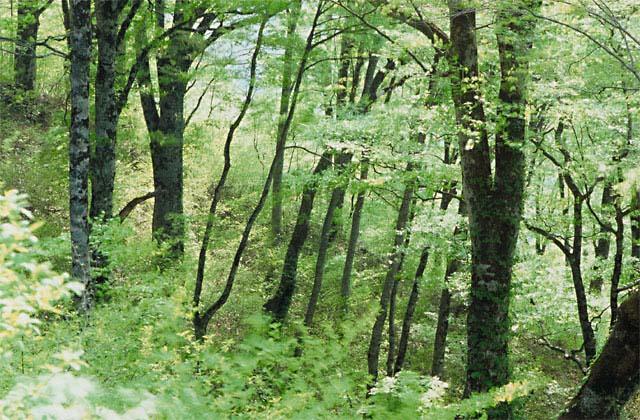 兵庫県香美町の植物「小城のブナ原生林」。小城集落から山道を90分で原生林の中腹に着く。小城区の裏山で標高700m~800mのところにひろがる4haのブナの純林である。500本といわれているがここのブナはシロブナとかツバブリと呼ばれる樹種である。林内にはミズメ、テツカエデ、ナツツバキなども見られる。
