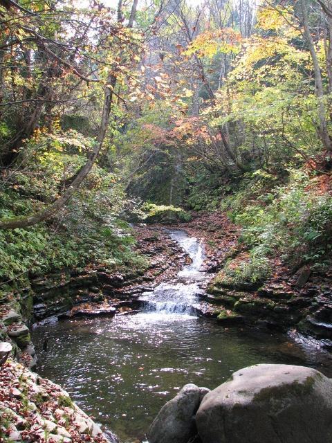 兵庫県香美町の河川景観「小代渓谷」。矢田川源流部の小代渓谷は、深い自然がそのまま息づいている渓流。深々とした原生林を縫うように小代谷が深い断崖を刻み、春は新緑に浮き上がる石楠花の群生、秋は錦の紅葉と四季折々に華やかな変化を見せてくれる。高山性の自然植生を残している数少ない地域でもあり、また、ヤマメ、アマゴなどの渓流釣りも楽しめる。