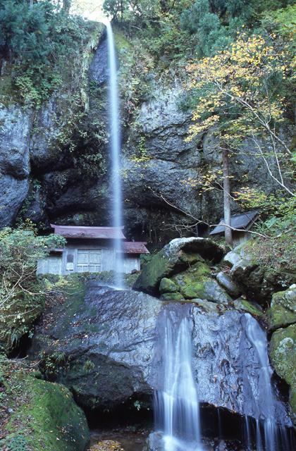 兵庫県香美町の河川景観「吉滝」。上下2段で形成され落差は28m。滝壺の背後にある洞窟中に吉滝神社があり、滝を裏側から見られるところから「裏見の滝」とも呼ばれる。