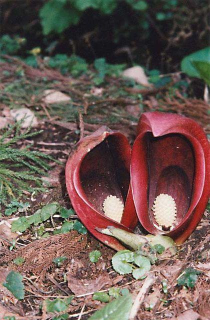 兵庫県香美町の植物「大笹ザゼンソウ群」。鉢伏山の北斜面に広がるハチ北高原には、ザゼンソウの群生地がある。ザゼンソウは10~15cmのかわいらしい花で、色は褐紫色。ミズバショウガまるまったようなかわいい形をしている。ここのザゼンソウは植生状態がきわめて旺盛で、群落は他で見られないほど素晴しい。