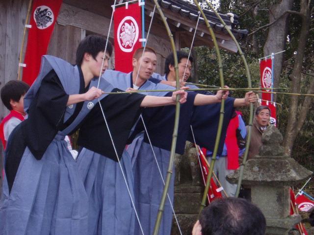 兵庫県香美町の行事・祭事「百手の儀式」。武芸の上達を願い101本の矢を放つ平家落人の伝統儀式。集落の人々が武士にふんし、平家の旗をもって神社まで向かい、竹で編んだ45cm四方の的に源氏の目を書いた紙を貼り、門脇・伊賀・矢引の三家の若者が、101本の矢を射る儀式です。